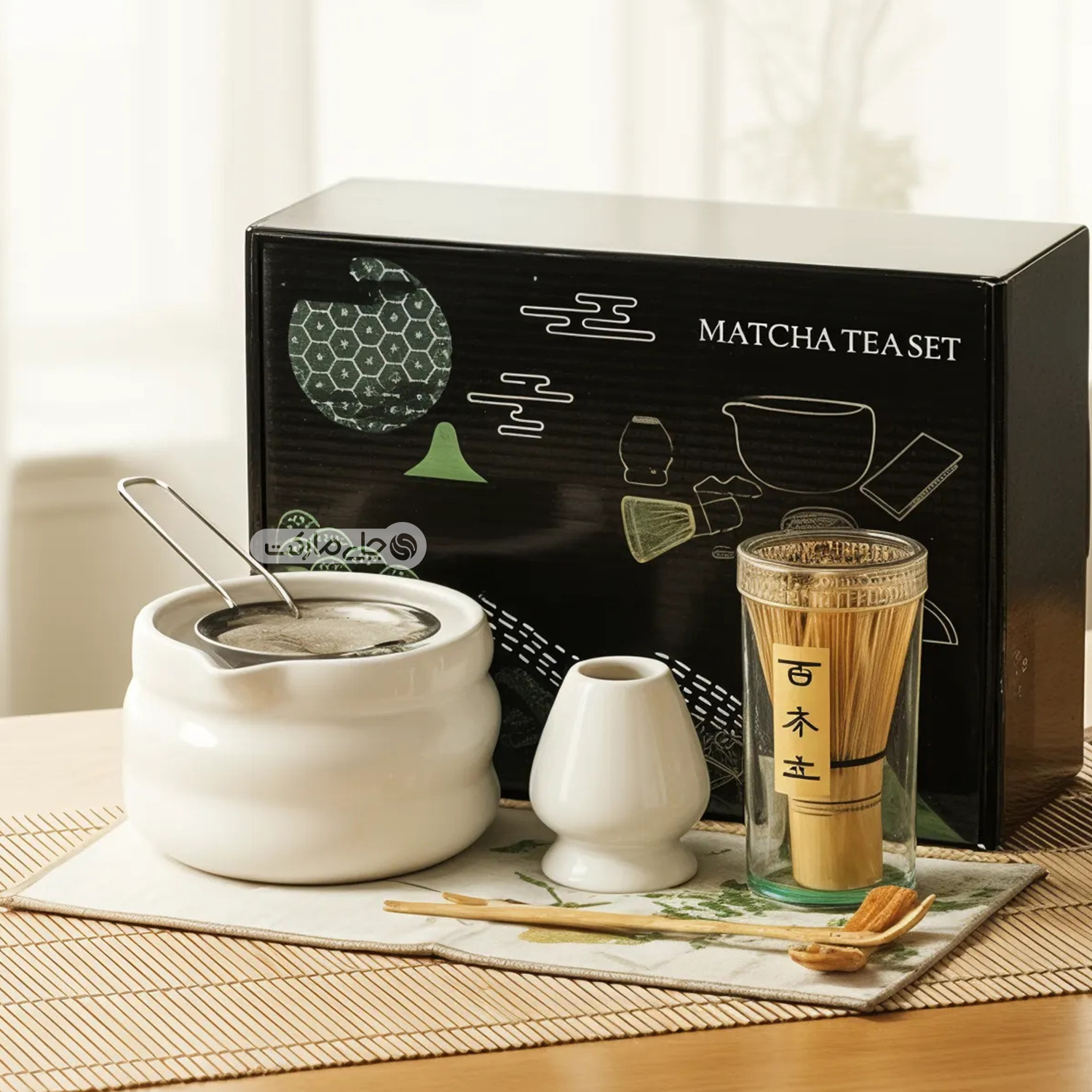 این ست کامل شامل تمام ابزارهای سنتی و ضروری برای تهیه یک فنجان ماچای اصیل و لذتبخش است: