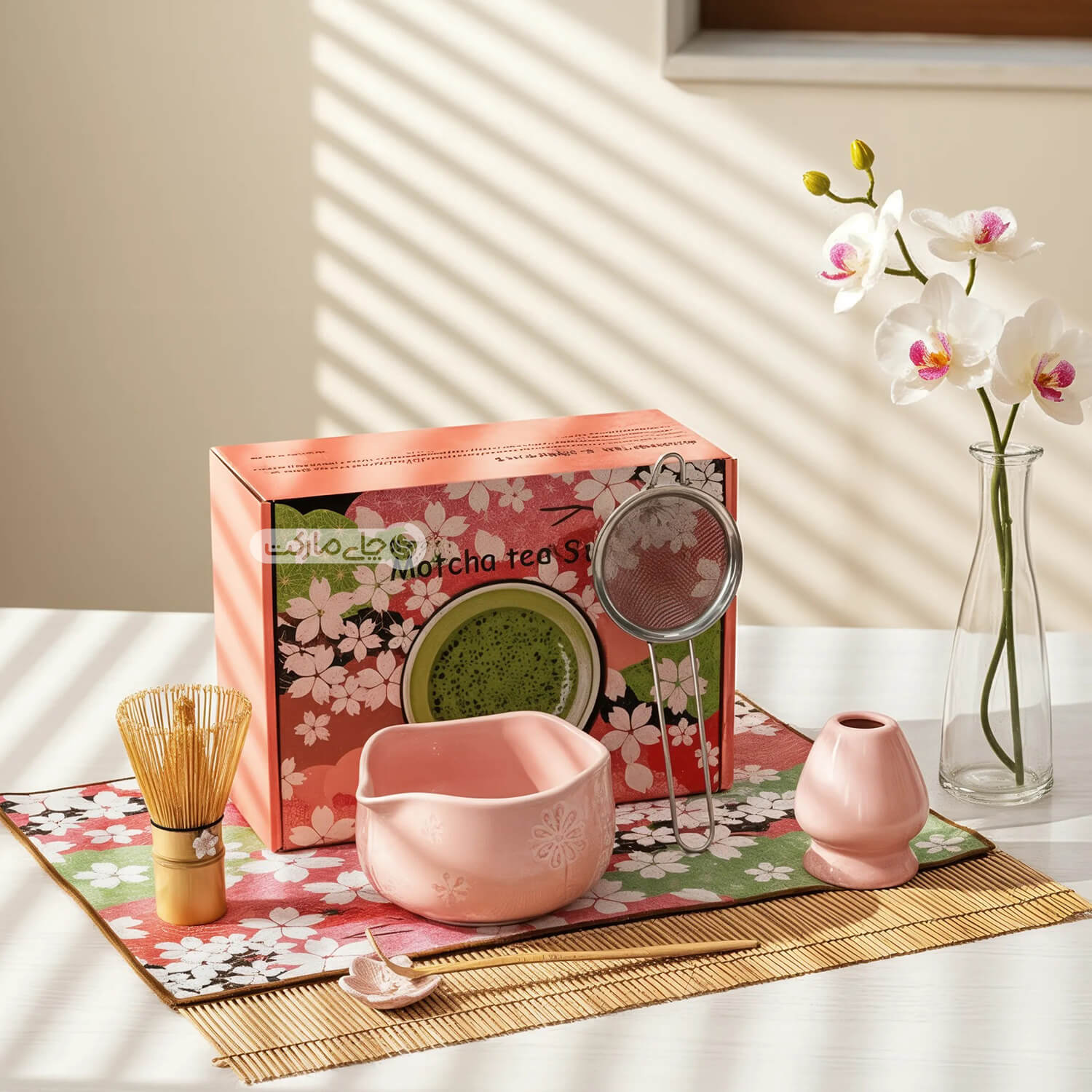 این ست کامل شامل تمام ابزارهای سنتی و ضروری برای تهیه یک فنجان ماچای اصیل و لذتبخش است: