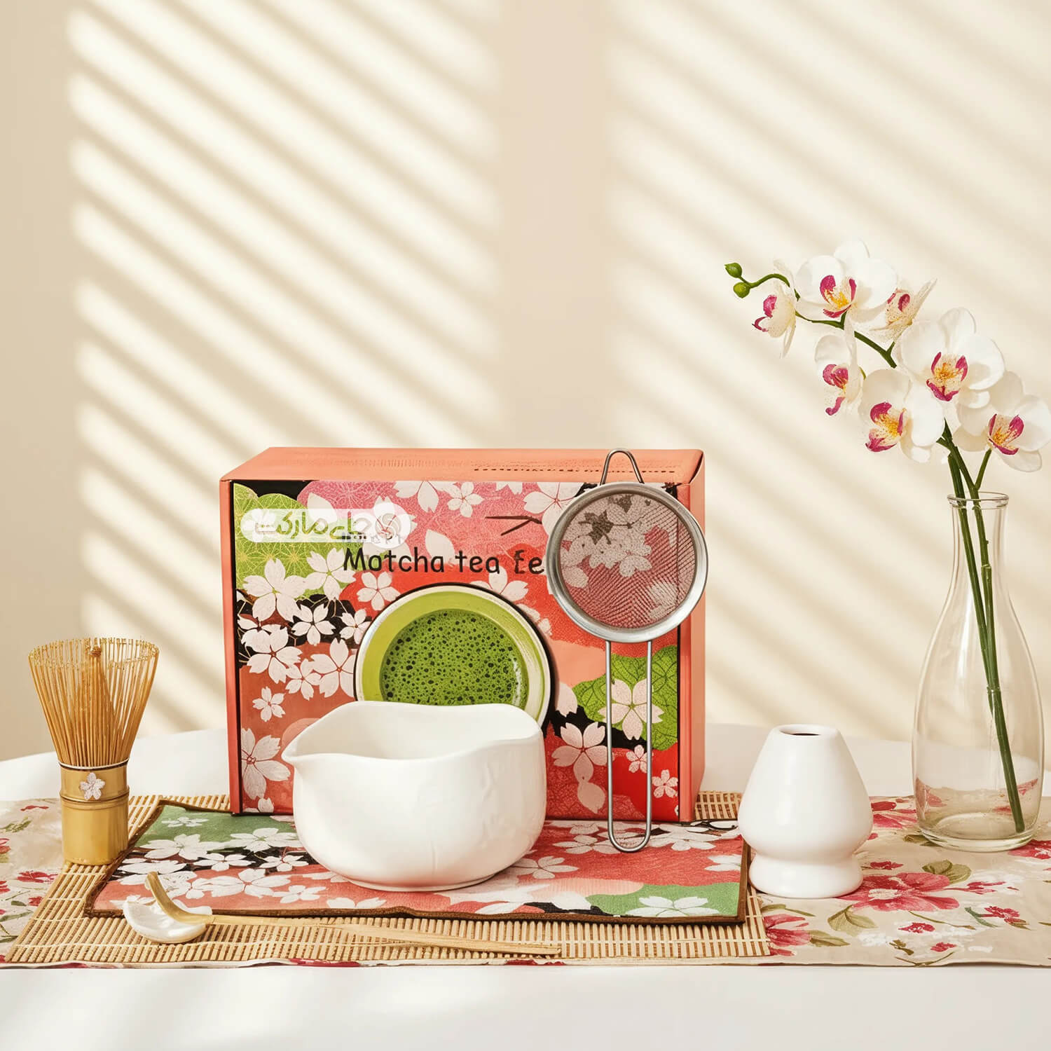 این ست کامل شامل تمام ابزارهای سنتی و ضروری برای تهیه یک فنجان ماچای اصیل و لذت‌بخش است: